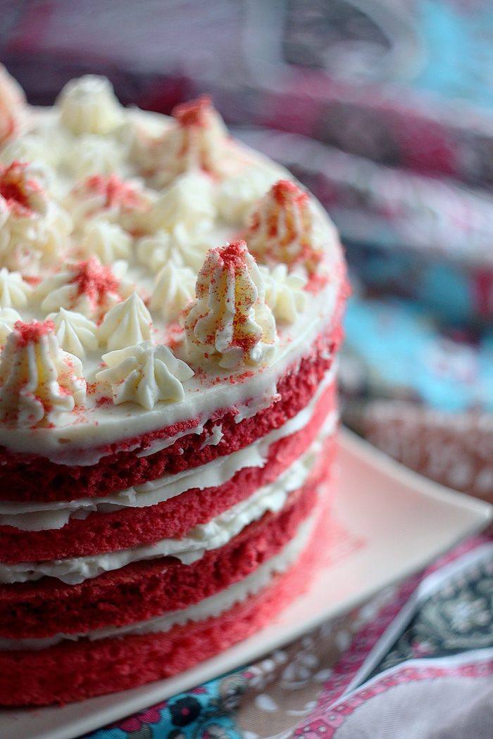 Взбить желтки с 2/3 сахара. Отдельно взбить белки, добавить оставшийся сахар, взбивать еще минуту. Смешать желтки и белки, перемешать. Добавить муку, краситель, разрыхлитель и снова аккуратно перемешать, но не долго, чтобы тесто не осело. Данного количества теста хватает на два коржа, но я хотела высокий торт, поэтому сделала еще и вторую порцию, куда добавила 2 ст.л. какао. Выпекать 25 минут при 200°C.