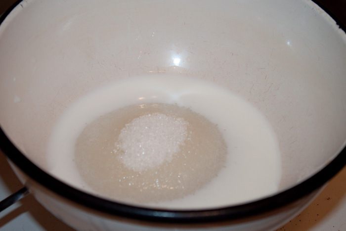 Сперва надо растопить сахар в молоке.