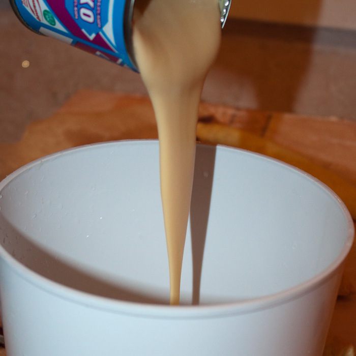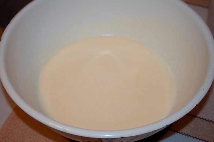 В емкость для взбивания крема вливаем сгущенное молоко.