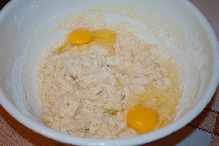 Добавить 0,5 ч. л. соды (загасить уксусом) и добавить 2 яйца.