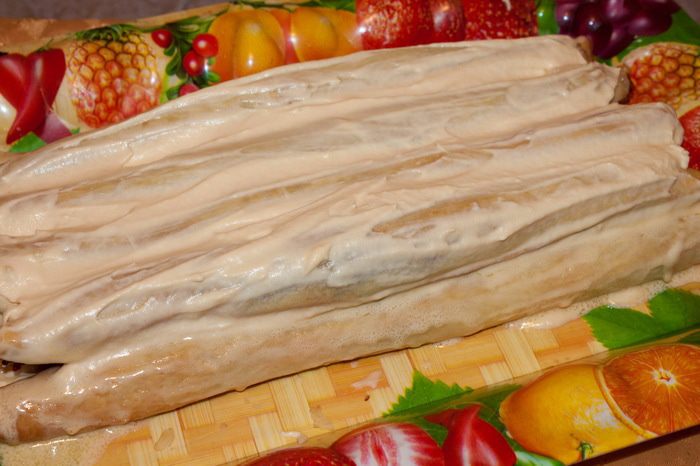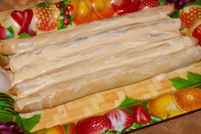 Сверху уложить 1 (одну) трубочку и все хорошо смазать кремом.