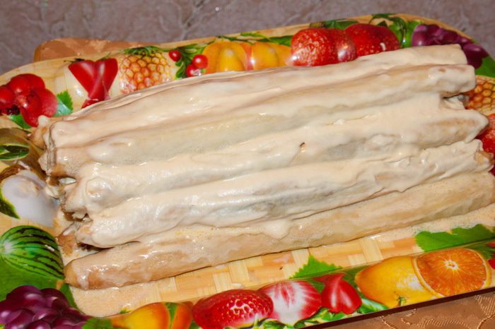 Затем 3 (три) трубочки, смазываем кремом.