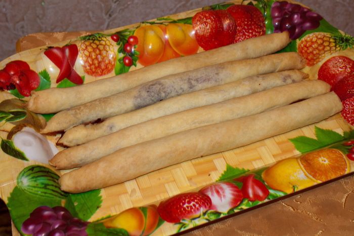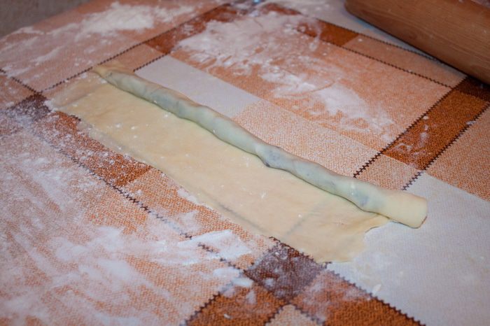 После охлаждения, раскатываем тесто «удлиненным прямоугольником» и по краю помещаем варенье.