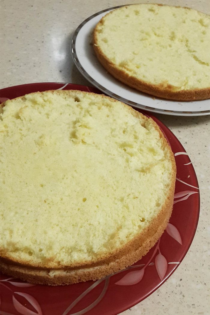 Бисквиты охладить, срезать неровные верхушки и каждый разрезать на 3 коржа. (У меня шоколадный бисквит на 2 коржа разрезан, пришлось много верхушки срезать, поднялась горкой)
