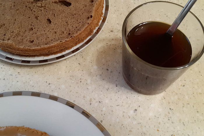 Приготовить пропитку для шоколадного бисквита. Смешать горячий кофе с сахаром, остудить.