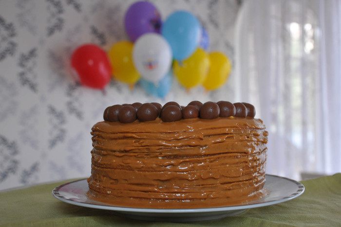 Каждый корж смазать кремом, а только шоколадные — пропитать кофе. Бока тоже смазать.