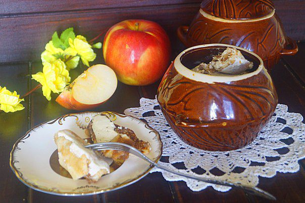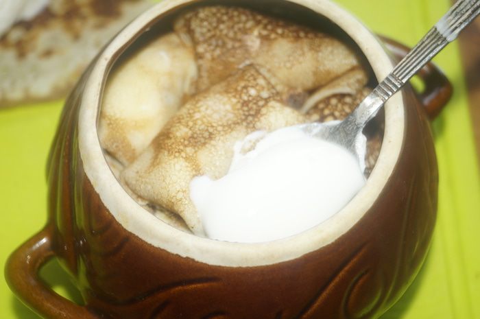 Выкладываем нафаршированные блинчики в смазанные сливочным маслом горшочки, каждый слой промазываем сметанной заливкой. Верх тоже смазываем сметаной. Накрываем крышечкой и ставим в разогретую до 150°C духовку, томиться на 1 час.