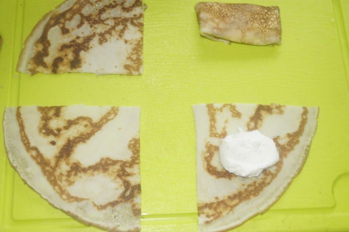 Берем один блинчик и режем на 4 одинаковых треугольника. На край выкладываем немного начинки и сворачиваем как голубец.