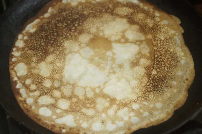 Выпечь тоненькие блинчики на хорошо разогретой сковороде, смазанной тонким слоем растительного масла.