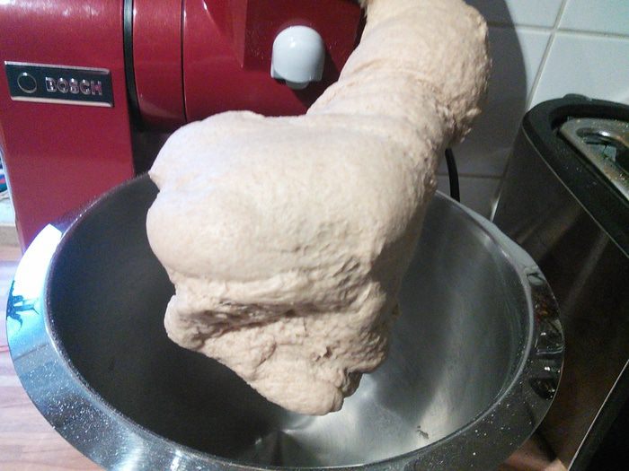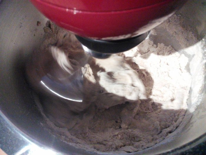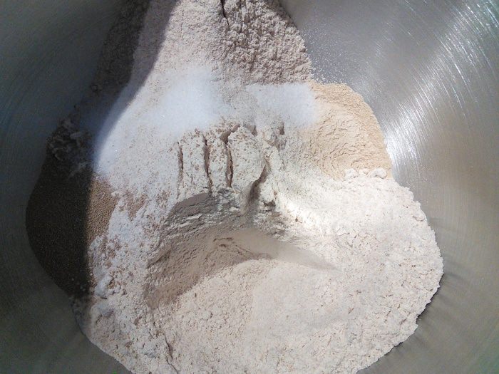 Смешать оба вида муки, закваску, дрожжи, соль.
