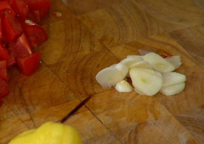 Чеснок почистить и нарезать тонкими пластинками.