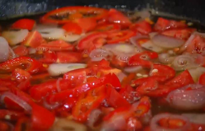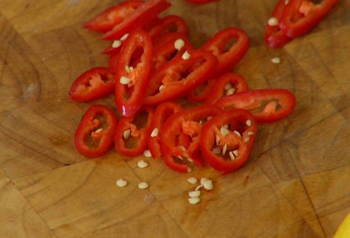 Перец чили нарезать колечками.
