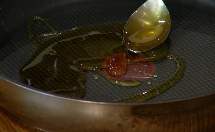 Приготовить соус: мед выложить в сковороду, влить 120–150 мл воды и прогреть на огне.