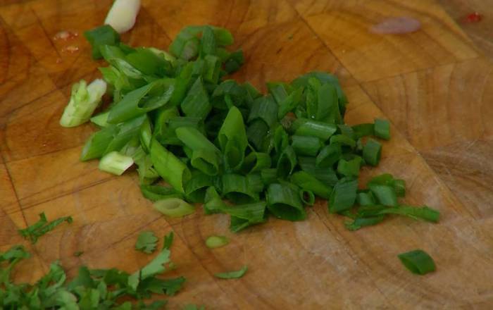 Зеленый лук тонко нарезать наискосок.