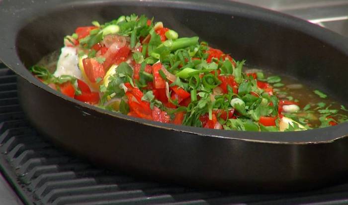 Готовую рыбу полить горячим соусом и посыпать измельченной зеленью.