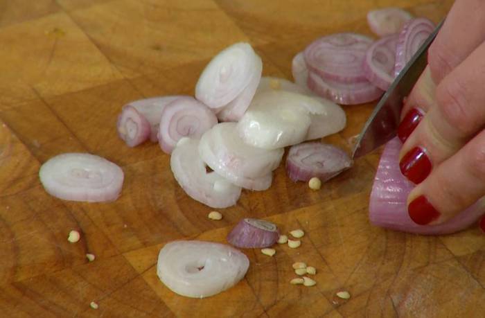 Шалот почистить и нарезать тонкими кольцами.