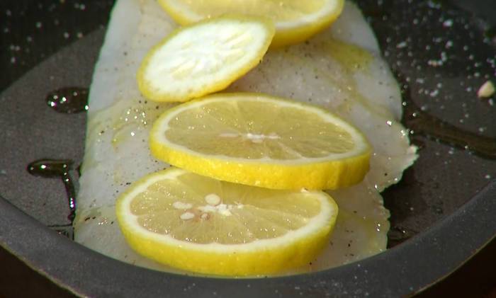 Половинку лимона нарезать кружками и поместить на рыбу. Отправить форму в разогретую духовку на 7 минут.