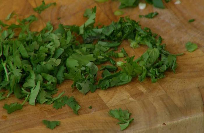 Листья кинзы и базилика крупно нарезать.