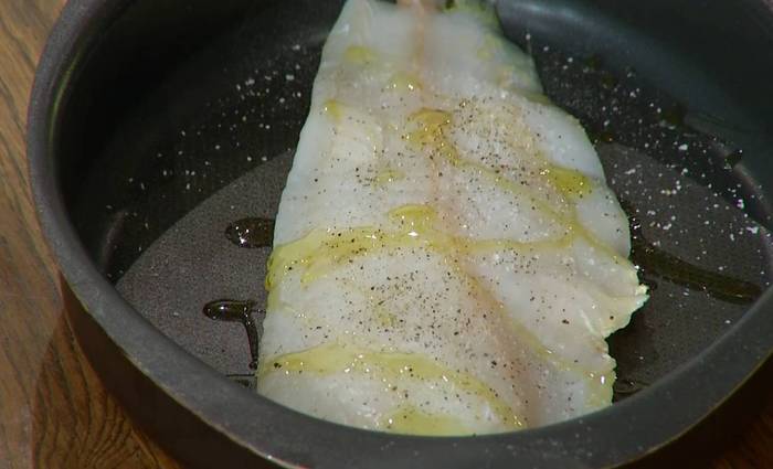 Филе трески посолить, поперчить, сбрызнуть со всех сторон оливковым маслом и выложить в форму для запекания.