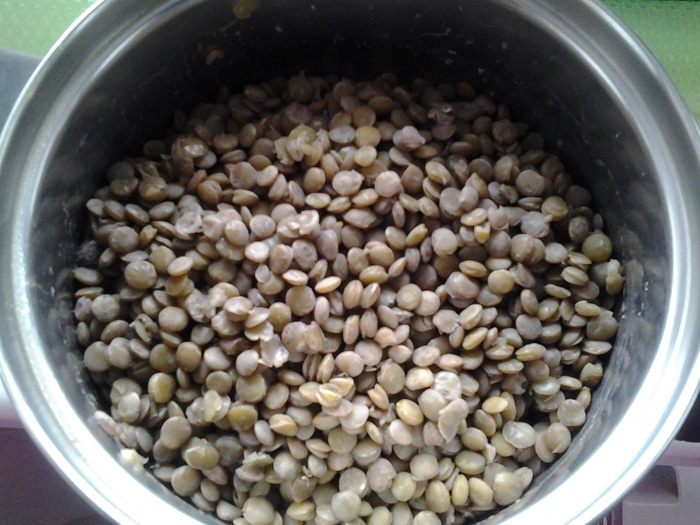 Чечевицу злить водой и оставить на несколько часов. Затем добавить соль и отварить до готовности.