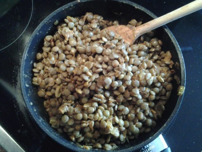 Через 2 минуты чечевицу. Тщательно перемешать, протушить 2-3 минуты.