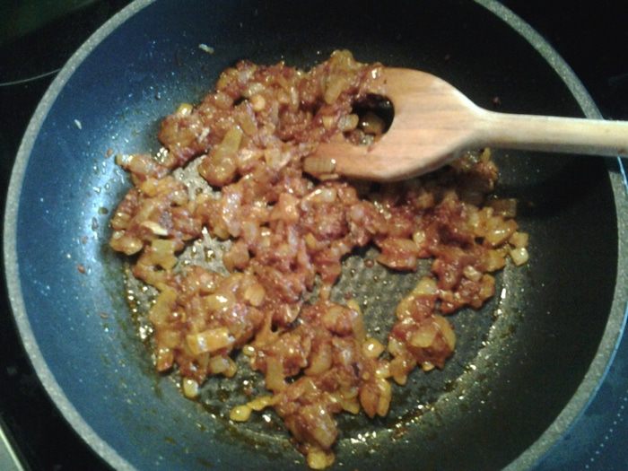 Через минуту добавить томатную пасту.