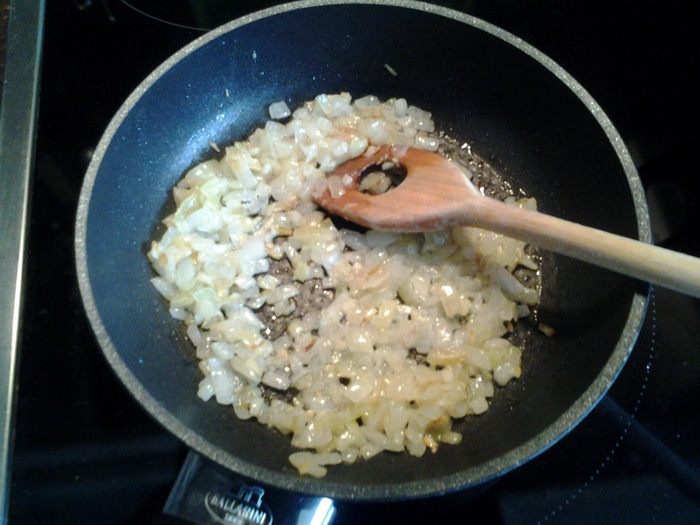 Лук и чеснок мелко порезать, обжарить с 2-я ст. л. оливкового масла до прозрачности на среднем огне.