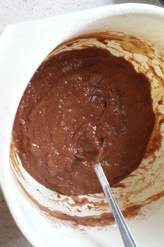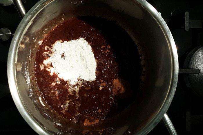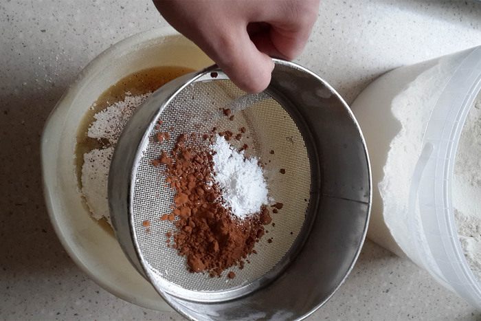 Немного остудить, перелить в миску. Добавить просеянную муку, разрыхлитель и какао.
