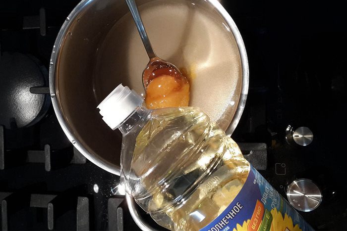 В кастрюльке нагреть сахар, воду, мед и масло. Нагреть, помешивая до растворения сахара.