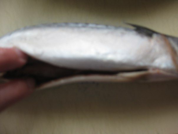 В обработанную и чистую рыбу во внутрь положить мелко нарезанный корень имбиря.