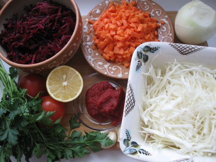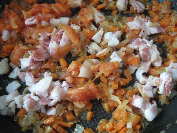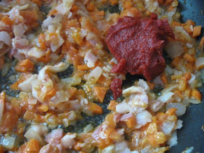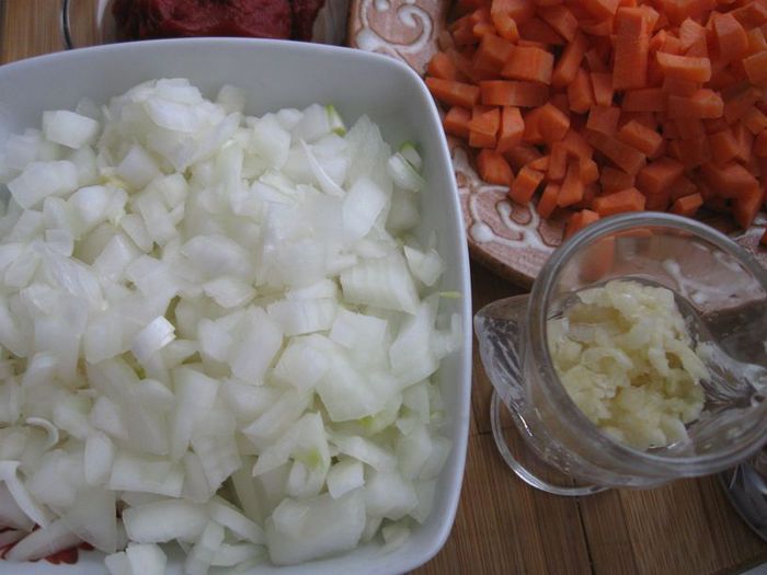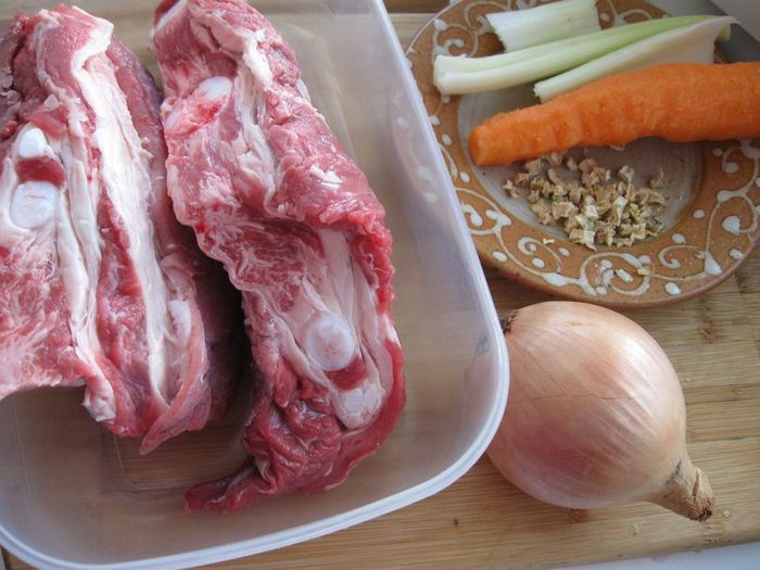 Приготовить все необходимое для бульона. Сварить бульон: положить мясо в кастрюлю, добавить очищенные 1 морковку, 1 луковицу; помытый стебель сельдерея, перец горошком (0.5 ч.л.), лавровый лист, сушеный корень петрушки (можно свежий), залить холодной водой, довести до кипения на сильном огне, убавить огонь, снять пену, посолить, варить 1ч.30мин. на медленном огне. Когда бульон немного остынет, мясо вынуть, бульон процедить. Если бульон варился накануне и вы поместили его в холодильник, можете снять застывший жир и поступить с ним по своему усмотрению. Я, например, добавляю его к борщу.