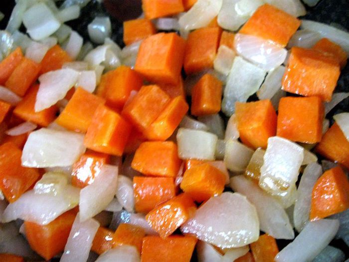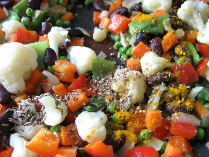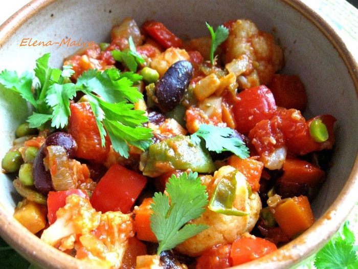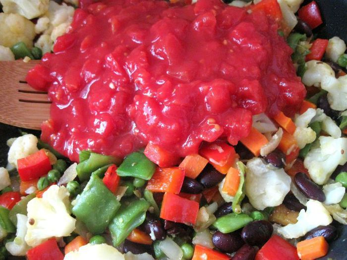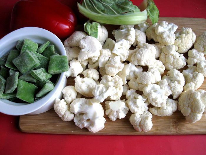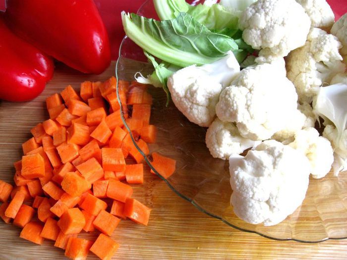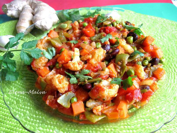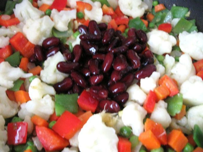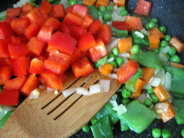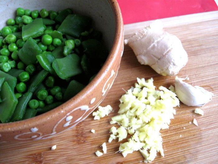 Затем добавить чеснок и имбирь, если у вас перец чили свежий (у меня в порошке), то добавьте его сейчас, мелко порезав, без семян, помните, что он очень жгучий и достаточно небольшого кусочка, и готовить, помешивая, еще 1-2 минуты. Затем очередь фасоли в стручках и гороха. Добавить сладкий перец.