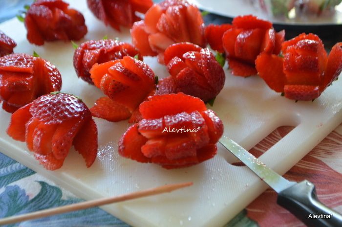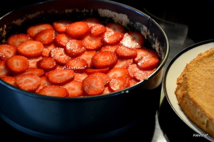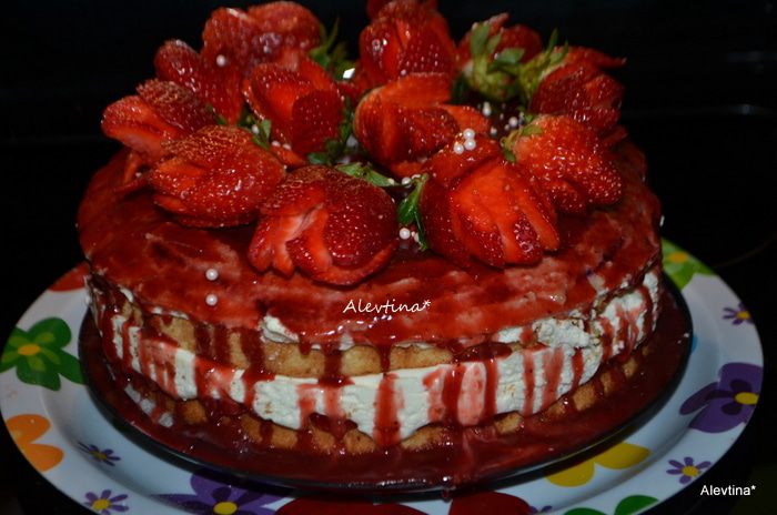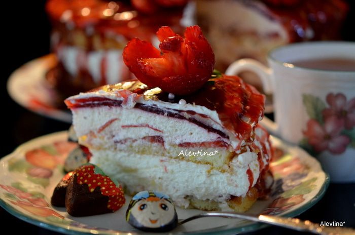 На следующий день сварить клубничное желе. Ягоды клубники замороженные или свежие сварить с водой и сахаром, помешивая, довести до кипения, снять с огня, выложить в блендер и взбить до однородной массы. Вернуть в кастрюльку и вновь довести до кипения, добавить агар-агар, перемешать, снять с огня . Через сито пропустить. Выход примерно должен быть 1 стакан после ситечка.