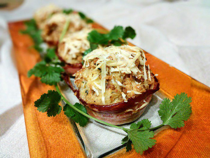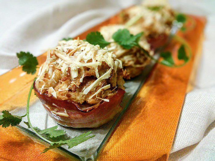 Формочки для маффинов смазать маслом и выложить полосками бекона. Распределить тесто и посыпать маффины оставшимся сыром.