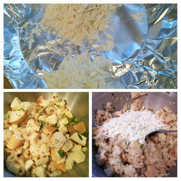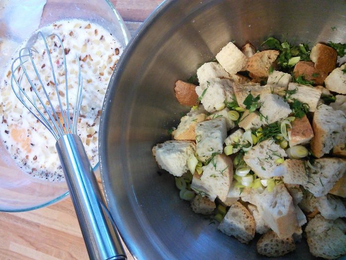 Смешать в миске молоко с зажаркой, добавить яйца и взбить венчиком. Посолить и поперчить, добавить мускатный орех. Выложить в смесь сухарики и мелко порезанный зеленый лук и зелень.