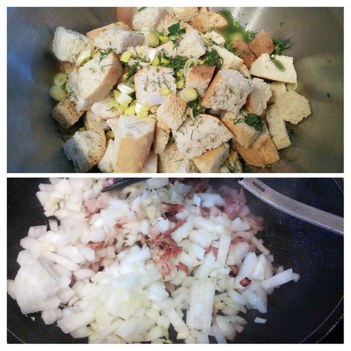 Хлеб порезать кубиком и запечь в заранее разогретой до 180°C духовке 5 мин. (я использовала уже готовые сухарики). Лук нарезать кубиком, 100 г бекона также мелко нарезать и обжарить вместе с луком на небольшом количестве масла до прозрачности лука. Снять с огня.
