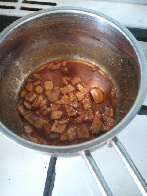 Сгущенку перелить в ковшик и греть на среднем огне 5-6 минут. Добавить набухший желатин, поварить еще 2-3 минуты, выключить, оставить на 1 минуту.