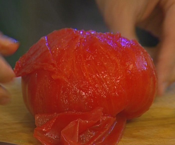 Помидоры очистить от кожицы и, удалив семена, порезать.