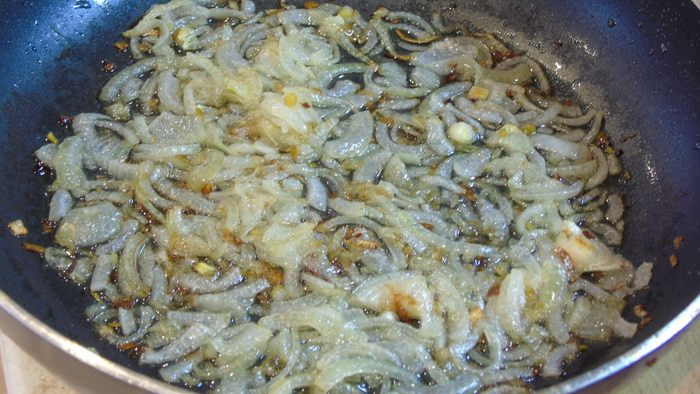 Лук нарезаем полукольцами и обжариваем на оливковом масле, отставляем в сторону.