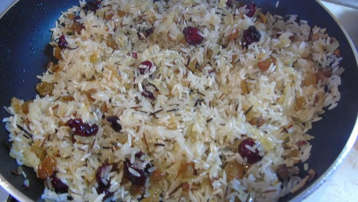 В сковороду к жареному луку добавляем рис, чернику сушеную (у меня изюм и клюква), корицу в палочках и, посолив и поперчив по вкусу, обжариваем немного, все время помешивая.