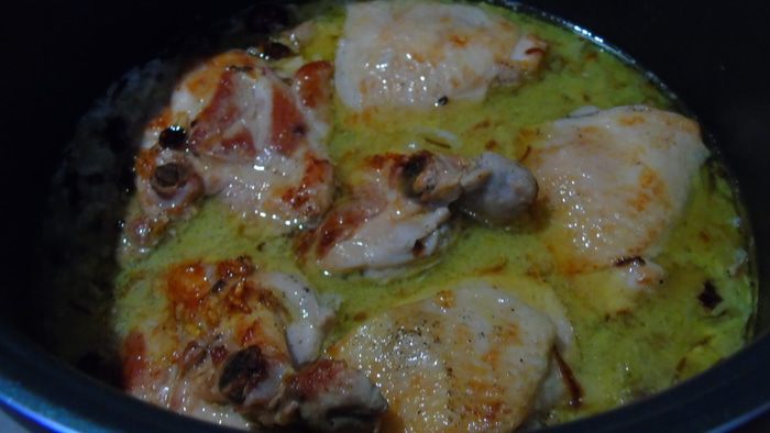 Сверху кладем кусочки курицы и заливаем водой кипящей, чтобы покрыло курицу. Накрываем крышкой и готовим на медленном огне 30 минут. Выключаем огонь и оставляем на 15 — 20 минут в покое. Перед подачей посыпаем нарезанной кинзой.