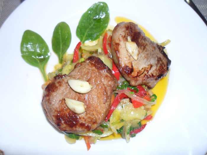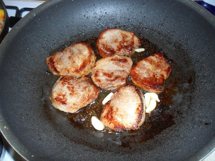 Обжарить на растительном масле по 3-4 минуты с каждой стороны, после того как перевернете, посолите и поперчите, и киньте в сковороду чеснок, целым. Снять с огня и накрыть фольгой, чтобы не остыли.