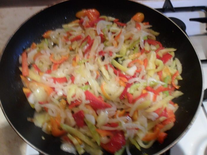 На небольшом количестве масла и большом огне обжарить нарезанный лук и перец, сразу добавить сахар, чтобы карамелизировать овощи.