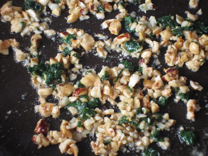В сковороде разогреть сливочное и оливковое масло, добавить орехи, петрушку, чеснок и прогреть 2 минуты.