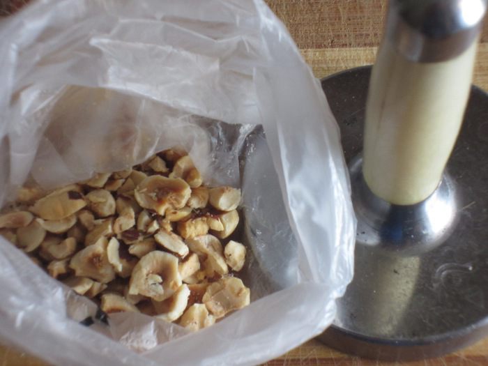 Фундук положить в полиэтиленовый мешок и крупно измельчить.