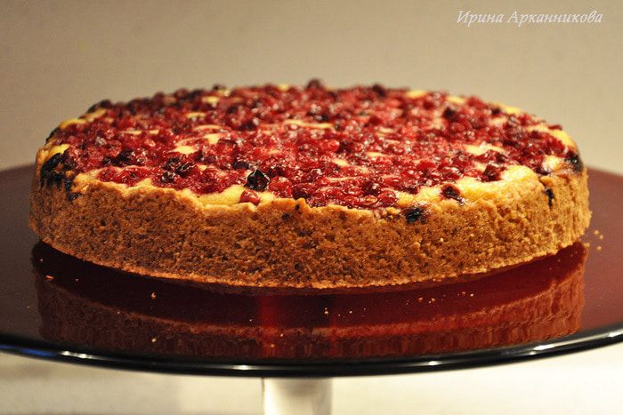 Разъемную форму диаметром 21 см устлать пергаментом (бока не нужно). Выложить тесто, размять руками, сформировав бортики. Запечь в разогретой духовке при 180 гр 10 минут. Сразу выложить (скорее - вылить) начинку , посыпать брусникой, слегка можно придавить руками. Выпекать еще минут 40. вытащить и остудить, поставить в хол-к минут на 30. Тогда десерт застынет и будет шикарно резаться.