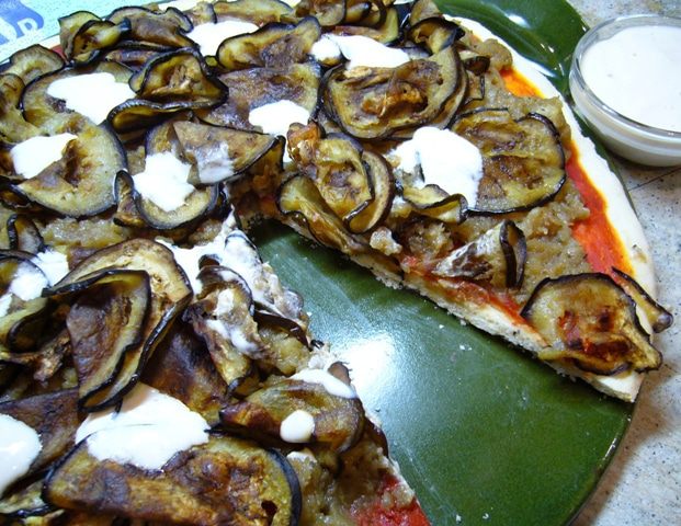 Достать пиццу из духовки, выложить сверху икру и чипсы из баклажана, вернуть в духовку еще на 3 мин.