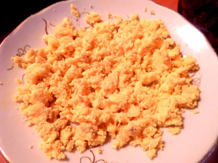 Желтки отдельно от белков размять вилкой.