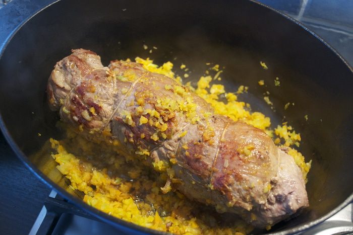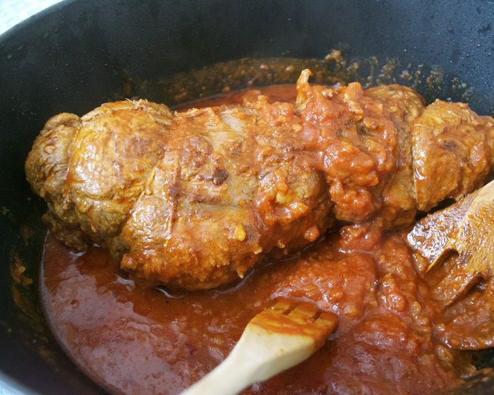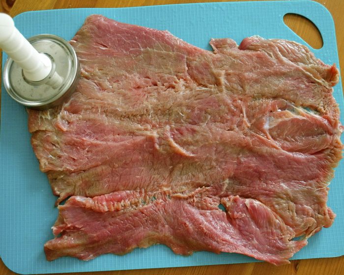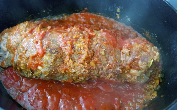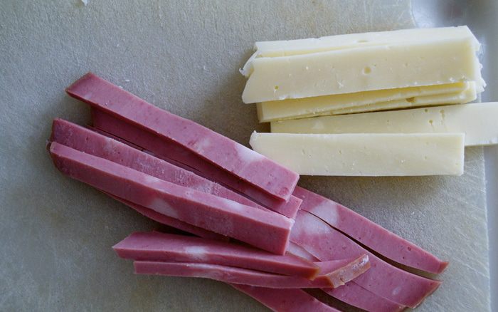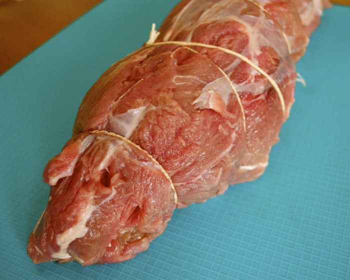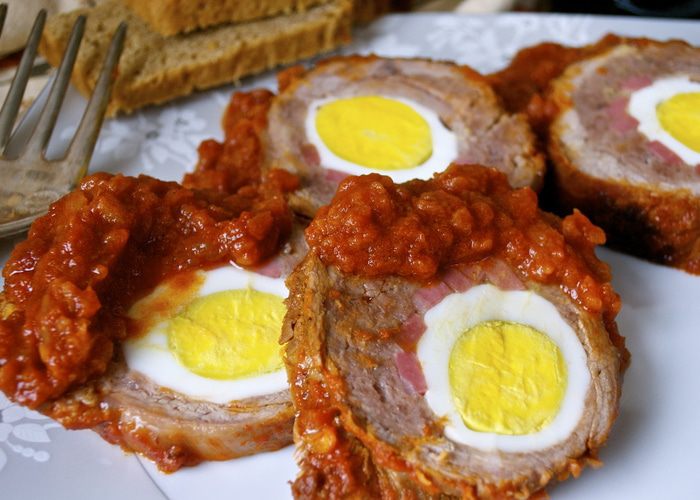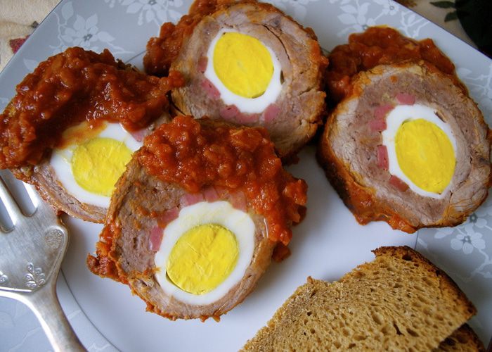 На подготовленную мясную мякоть выложить ровным слоем фарш. Разровнять, оставляя по краям примерно 2 см без начинки, чтобы при скручивании рулета начинка не вышла из него. Сверху и посередине выложить все остальные компоненты начинки; мортаделлу, сыр и сало (если Вы его используете!) В самом конце сверху положить в ряд вареные яйца!