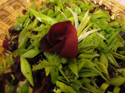 В сковороде разогреть оставшиеся 2 ст. ложки масла и выложить нарезанные кружочками в 0,5 см помидоры. Через минутку перевернуть, посыпать щепоткой молотого кориандра и оставить на сковороде еще минутку, затем выложить на фенхель. Сверху выложить нарезанные колечками оливки. Помидоры я не солю, т.к. оливки достаточно соленые.